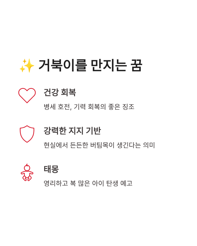 - 거북이를 만지는 꿈: 질병 회복, 장수, 명석한 두뇌를 가진 아이의 태몽.