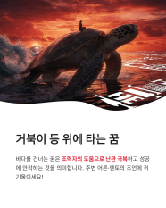 해몽에서 동물의 크기는 곧 그 행운의 밀도와 비례하죠. 큰 거북이 꿈은 단순한 금전운을 넘어 명예와 지위의 상승을 뜻합니다. 집채만 한 거북이를 보거나 그런 거북이의 등 위에 올라타 바다를 건너는 꿈은, 여러분이 소속된 조직에서 최고의 자리에 오르거나 사회적으로 큰 영향력을 행사하게 될 것을 의미해요.