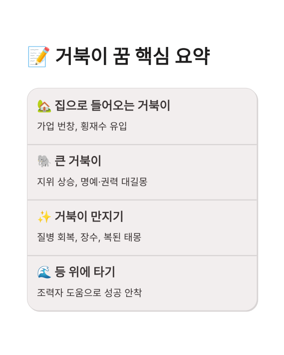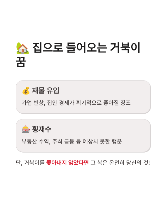 - 집으로 들어오는 거북이: 가업 번창, 부동산운, 예상치 못한 횡재수의 유입.