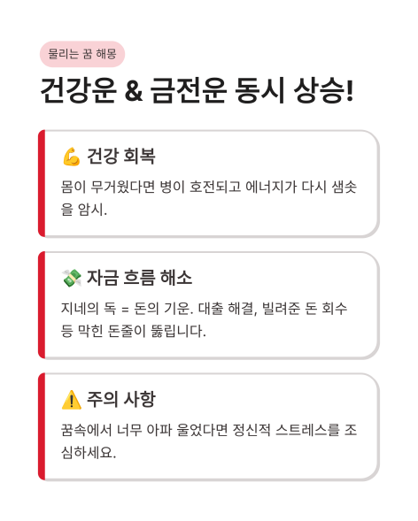 경제적인 측면에서도 아주 좋습니다. 지네의 독이 내 몸에 퍼진다고 생각하면 끔찍하지만, 해몽학적으로는 '돈의 기운'이 내 몸에 들어온다고 해석하거든요. 대출이 해결되거나, 빌려줬던 돈을 돌려받는 등 막혔던 자금 흐름이 뻥 뚫리는 경험을 하실 수 있습니다. 다만, 물린 부위가 너무 아파서 꿈속에서 펑펑 울었다면 정신적인 스트레스를 조심해야 한다는 경고의 의미도 있으니 내 마음을 한번 돌봐주세요.