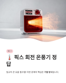 오늘 첫 번째 퀴즈는 일교차가 큰 요즘 꼭 필요한 '픽스 회전 온풍기' 관련 문제입니다. 제가 예전에 인테리어 현장에서 일할 때 발이 시려서 고생한 적이 있는데, 그때 이런 소형 온풍기가 정말 간절하더라고요. 이번 문제의 핵심은 제품의 가열 방식입니다.
