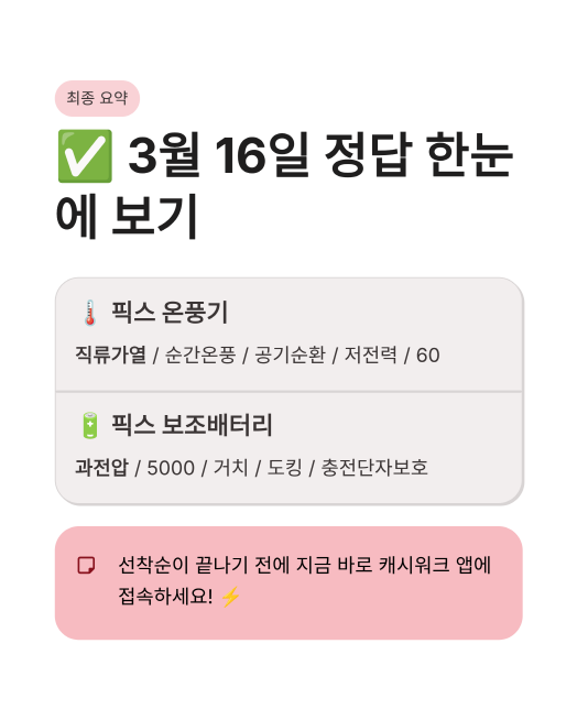 3월 16일 캐시워크 퀴즈정답, 픽스 온풍기 캐시워크 정답, 픽스 보조배터리 정답, 돈버는퀴즈 실시간, 오늘 캐시워크 정답, 앱테크 추천, 픽스 블랙프라이데이