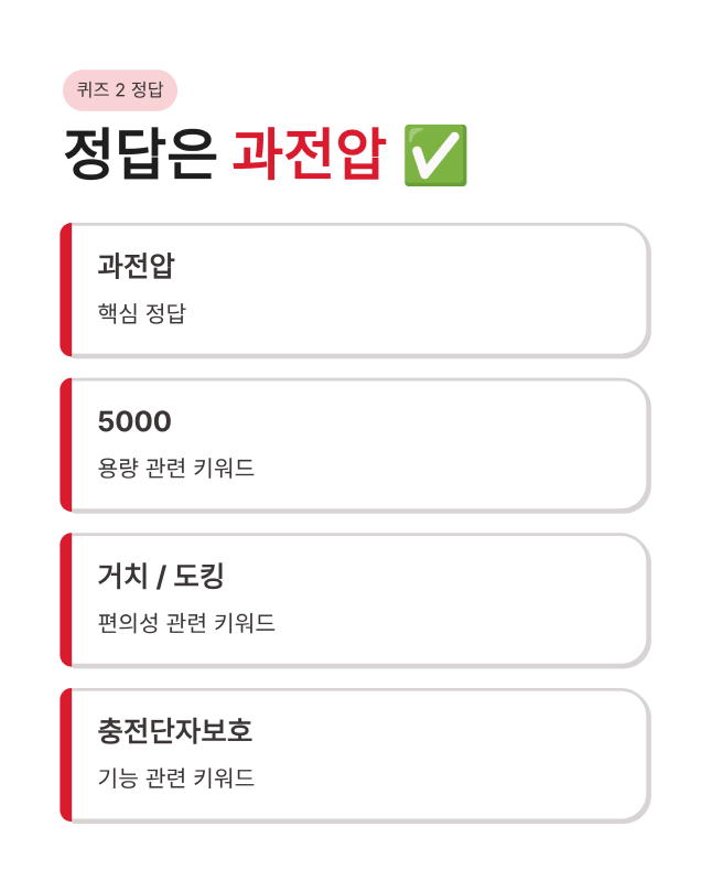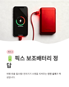 다음 퀴즈는 여행이나 외출 시 필수템인 보조배터리 소식이에요. 특히 이번 제품은 전자기기 수명을 지켜주는 안전 설계가 돋보이는데요. 저처럼 야외 활동이 잦거나 스마트폰 사용량이 많은 분들에게 아주 유용한 정보가 될 것 같습니다.
