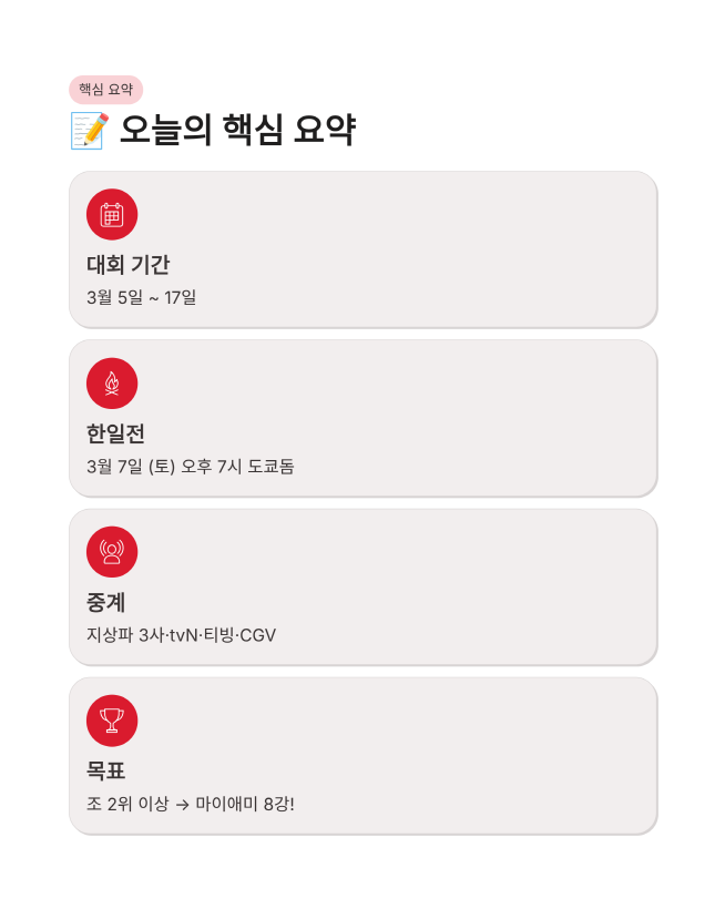 - 핵심 경기: 3월 7일(토) 오후 7시 숙명의 한일전 (도쿄돔)